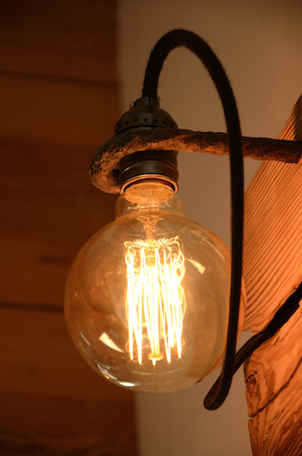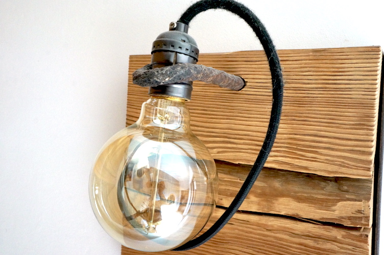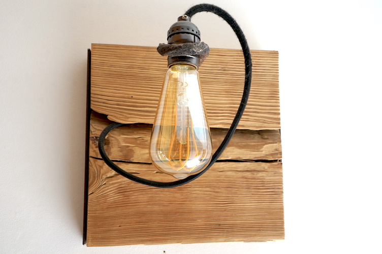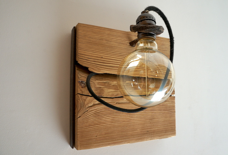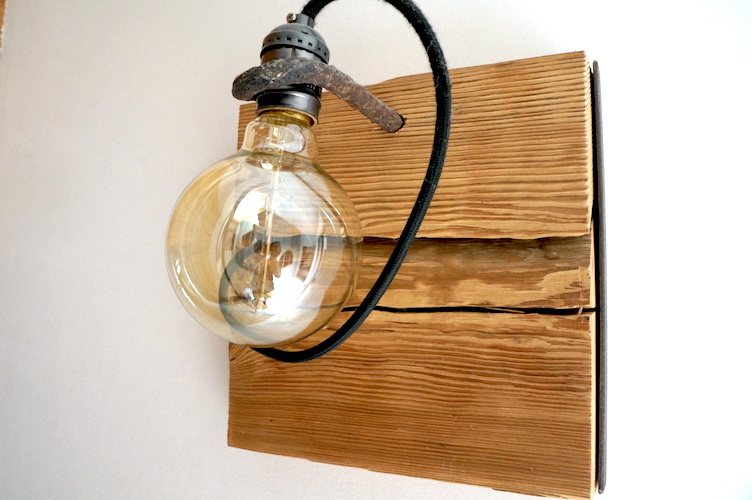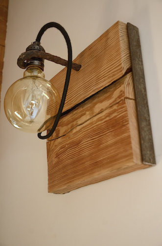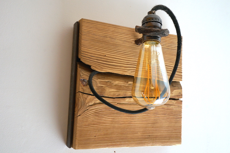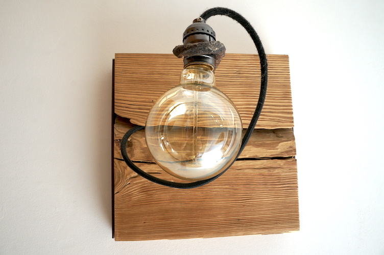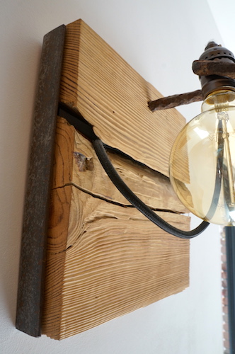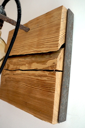 Applique en mélèze et cornières acier vieilli, douille portée par tige filtée vieillie, alimentation par gaine coton vintage.