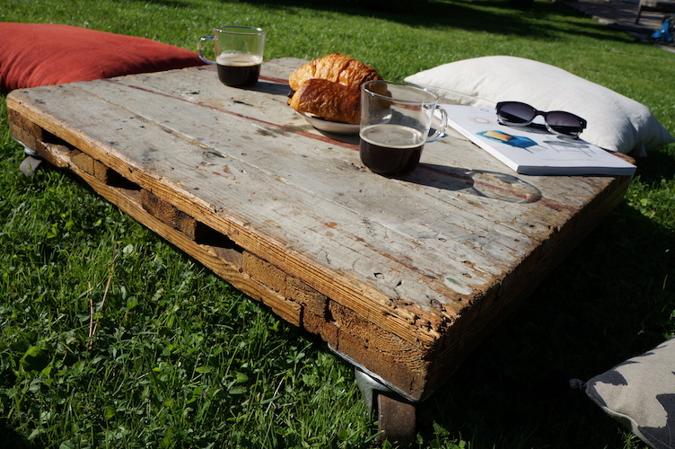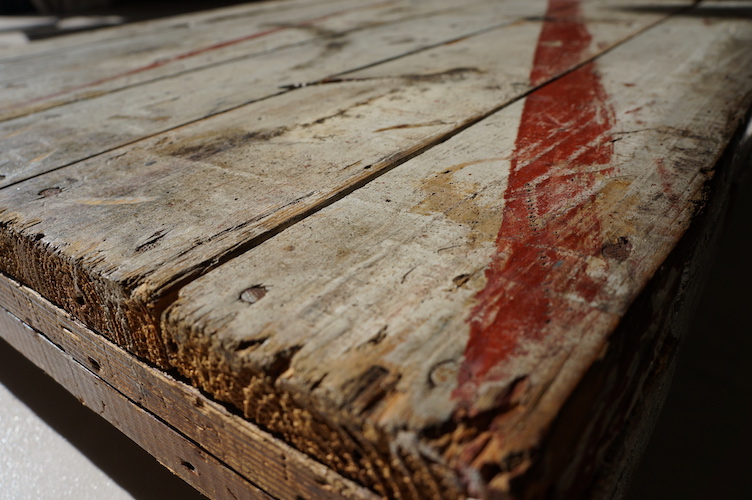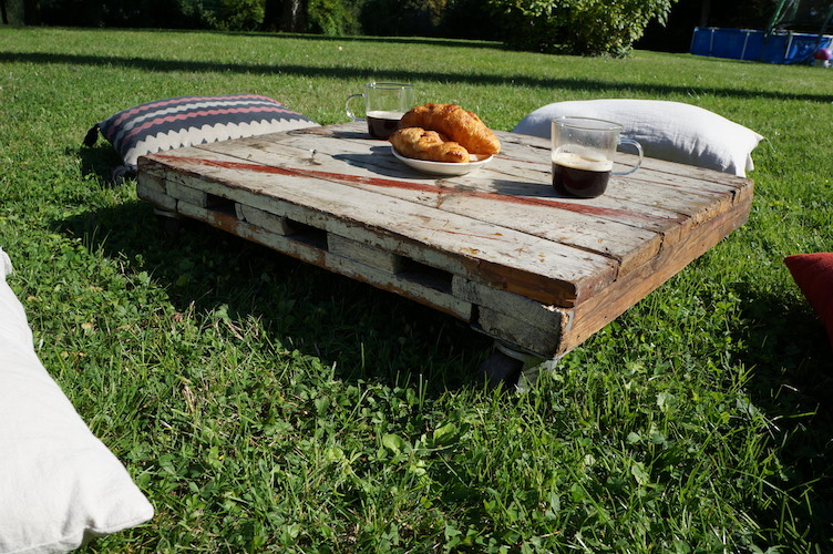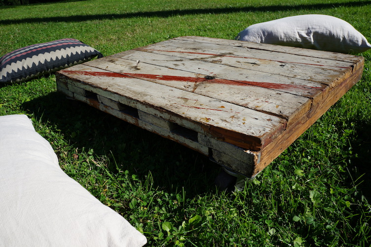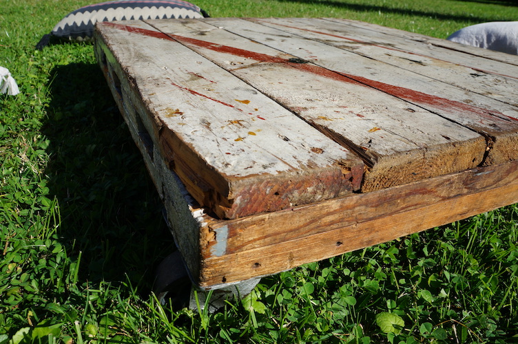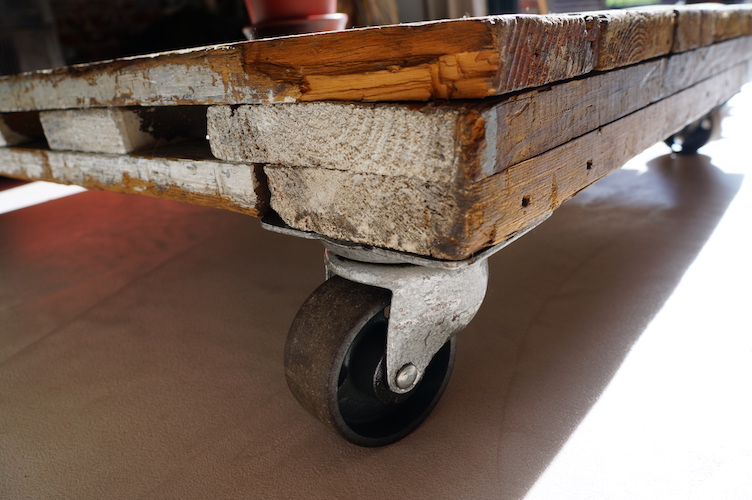 Table basse BETSY. Ancienne palette de transport industriel pour charges lourdes sur roulettes acier. Plateau peint nettoyé et laissé en l'état.