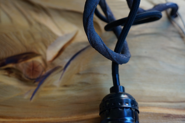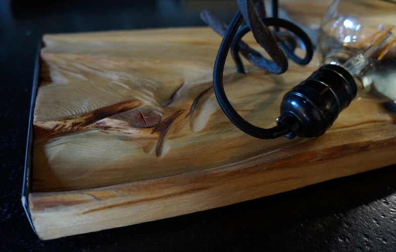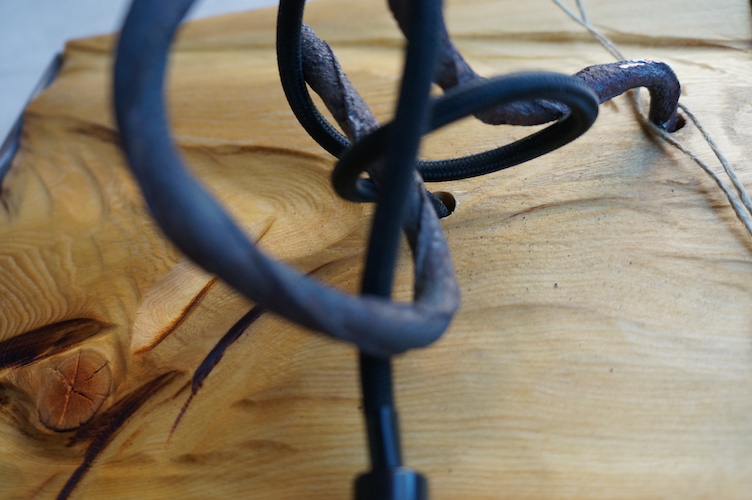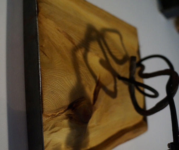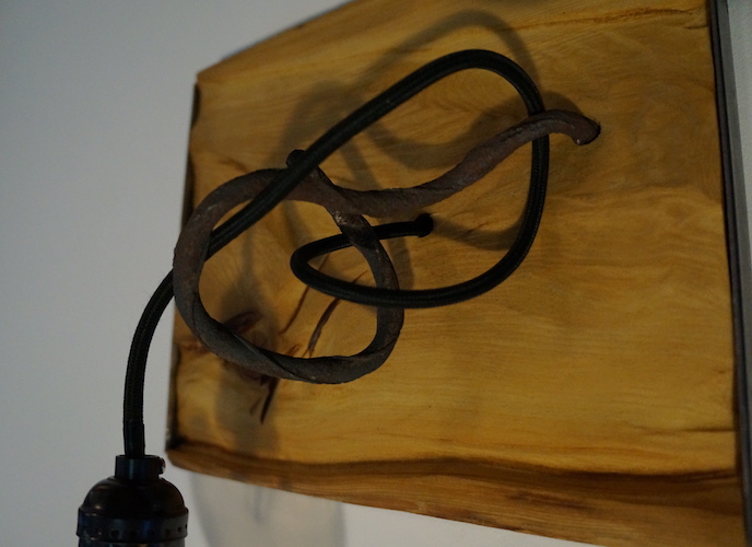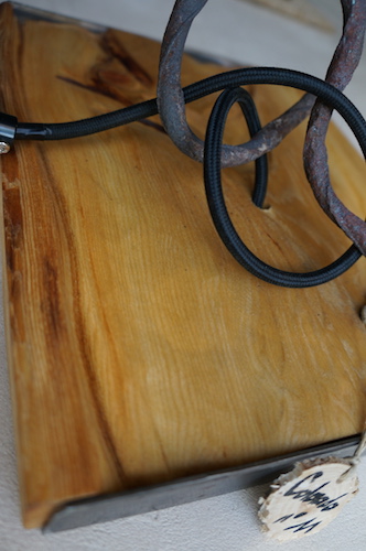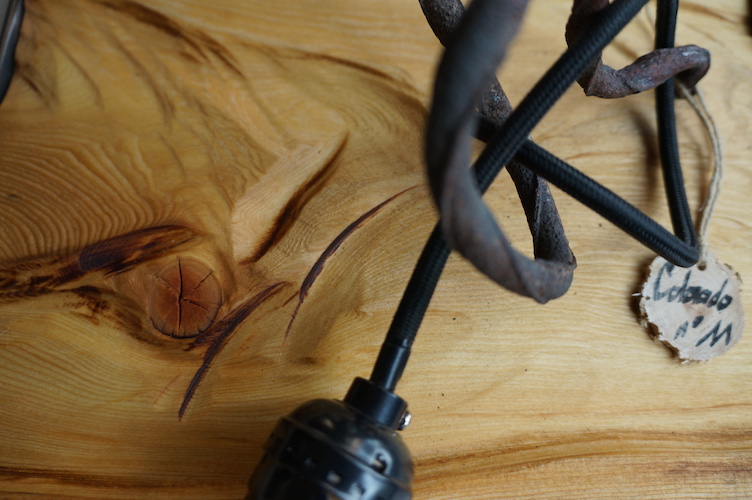 Applique COLORADO N°11. Applique en mélèze et cornières acier vieilli, douille portée par tige filtée vieillie, alimentation par gaine coton vintage.