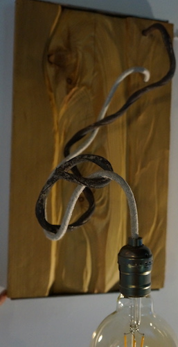 Applique COLORADO N°5. Applique en mélèze et cornières acier vieilli, douille portée par tige filtée vieillie, alimentation par gaine coton vintage.