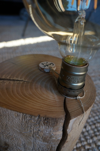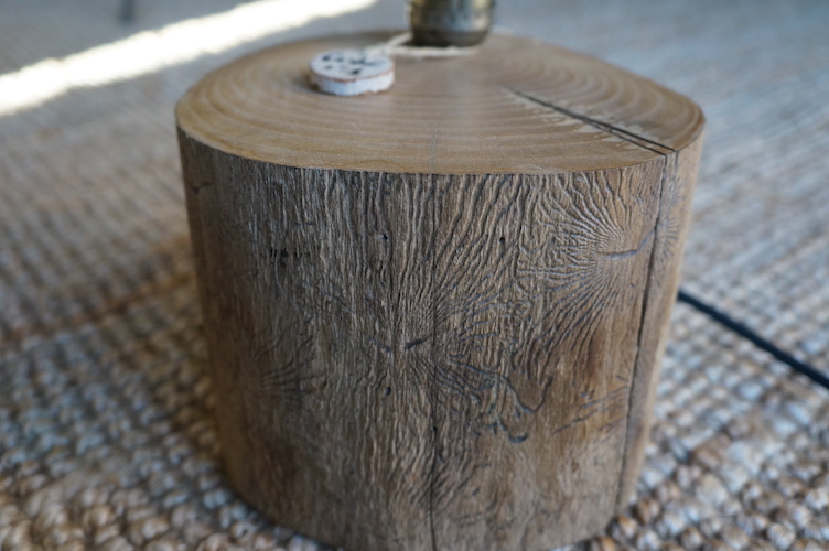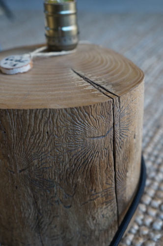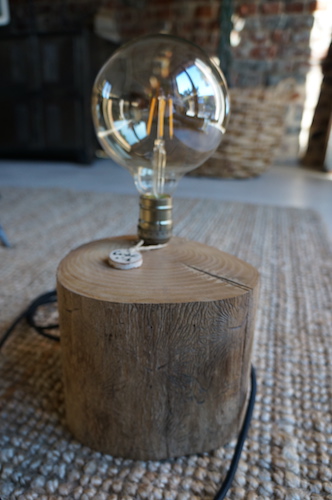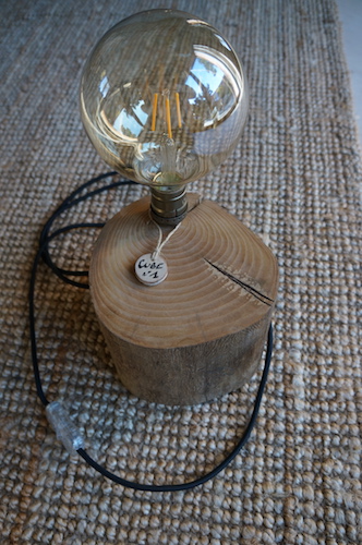 Lampe CUBE N°1. Lampe à poser, rondin massif en alisier, alimentation par gaine coton vintage.