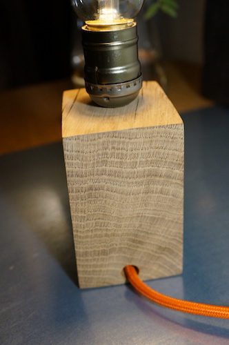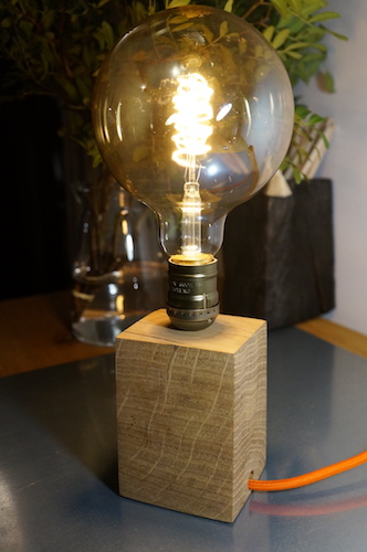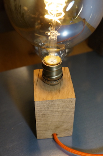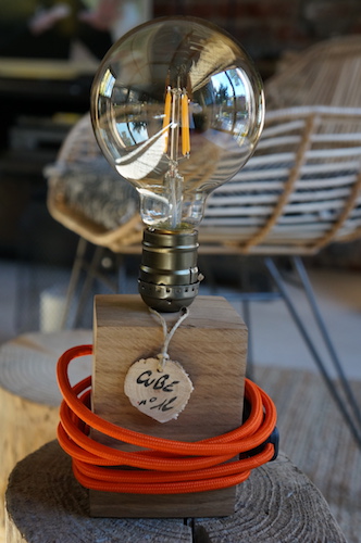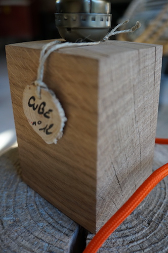 Lampe CUBE N°12. Lampe à poser, cube en chêne taillé dans la masse, alimentation par gaine coton vintage.