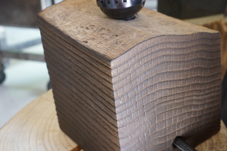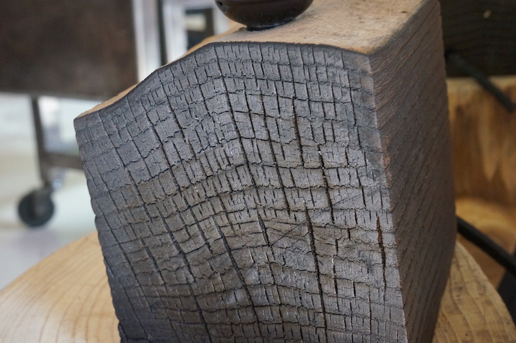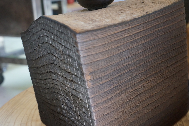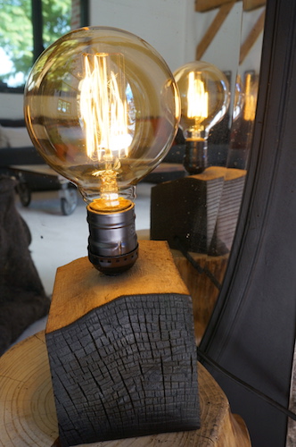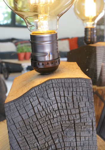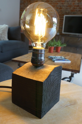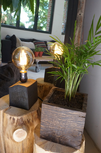 Lampe cube FRÊNE. Lampe à poser, cube en frêne massif traité « bois brûlé », alimentation par gaine coton vintage.