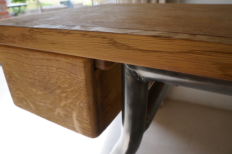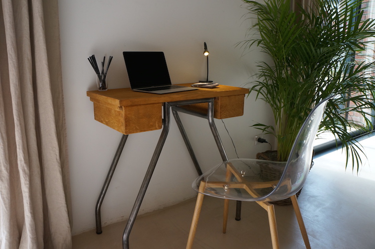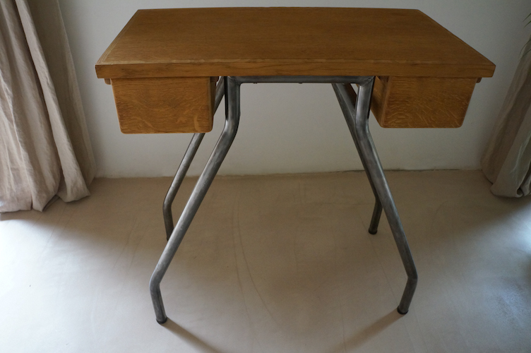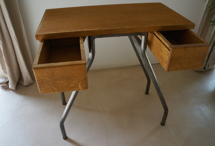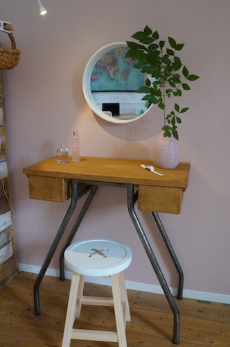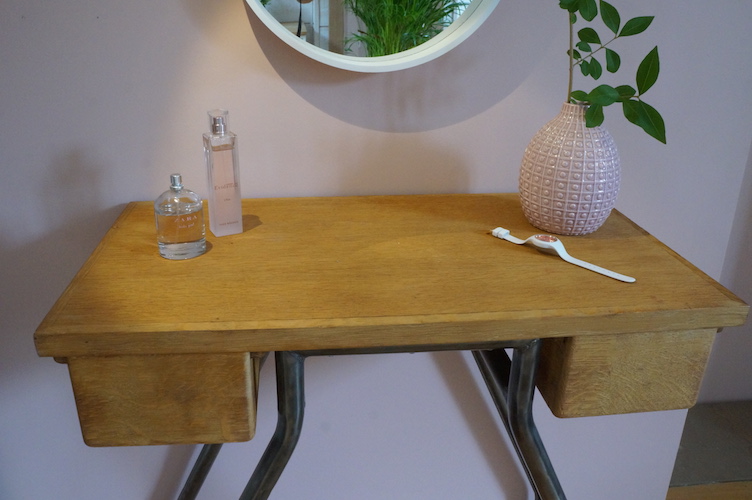 Console JULIETTE. Table de couturière façon bureau d'appoint ou coiffeuse. Meuble de métier deux tiroirs, décapé et traité.