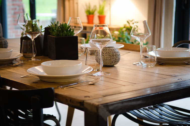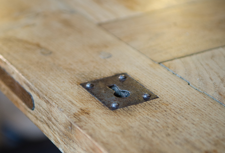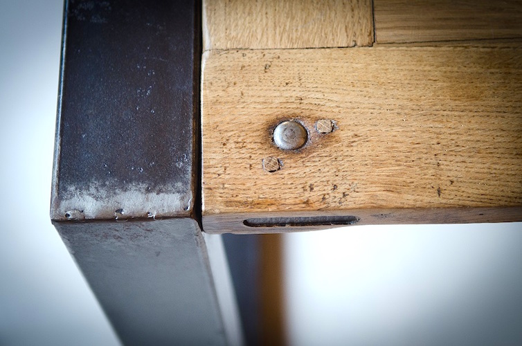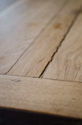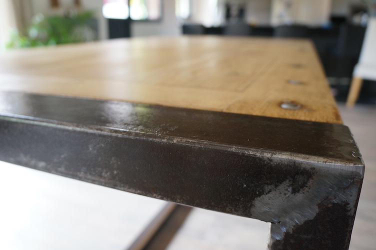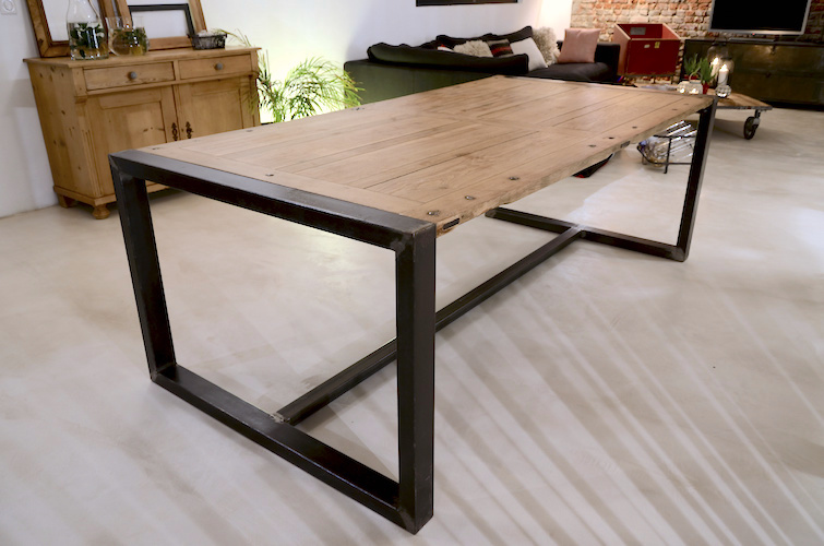 Table de séjour ÉMILIE. Table réalisée à partir d'une porte de grange en chêne massif, piètement acier verni. 10 pers.
